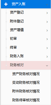 管理员身份进入模块【资产入账】-【财务核对】,包含图28中所示全部子功能,支持进行大批量审核,支持excel导出,等功能 ;