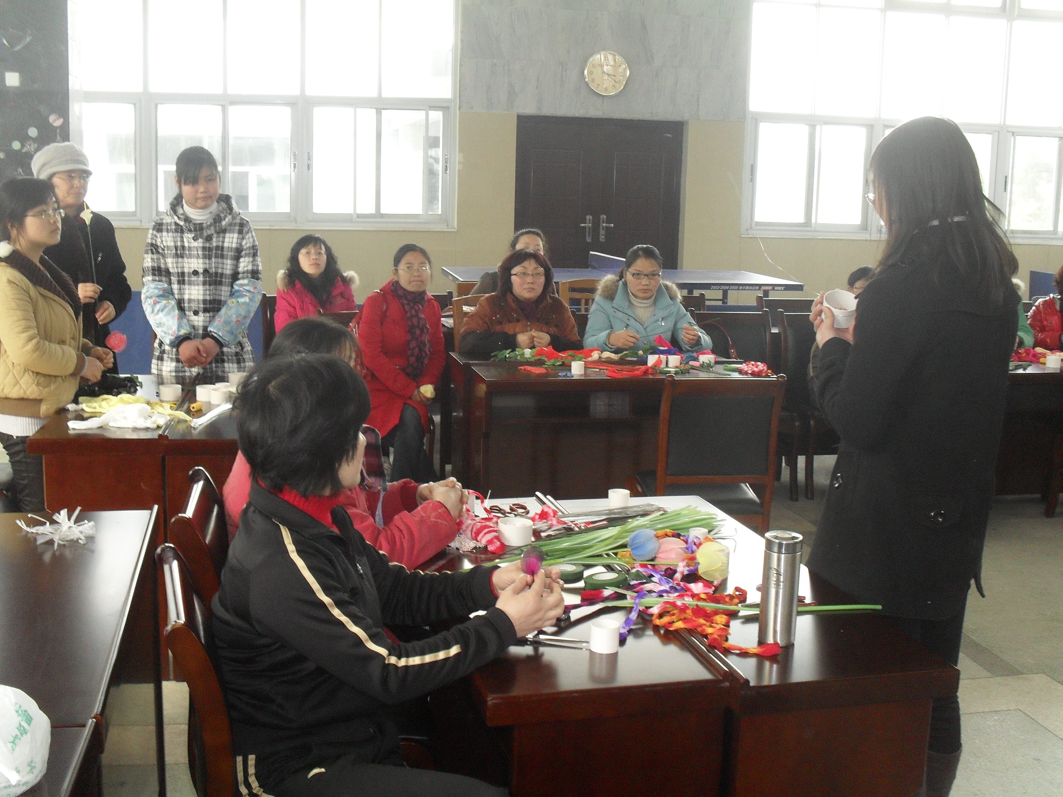 3月9日下午,整个亿万先生mr01官网报告厅其乐融融。由亿万先生mr01官网分工会组织的学习制作丝网花活动为我院女老师带送上了节日的祝福。花卉协会的同学首先向各位老师全面而生动地讲解了丝网花制作的各个步骤。而后老师们便积极动手进行实践,玫瑰、百合......一朵朵绚丽而又逼真的花朵在老师们的手中绽放,老师们对自己的劳动成果都非常的满意。