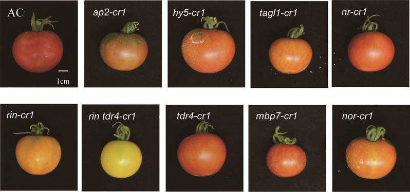 该研究通过利用CRISPR/Cas9技术获得果实成熟相关转录因子RIN、TDR4(FUL1)、MBP7(FUL2)、AP2a、HY5、TAGL1、NR、NOR的单突变体以及RINTDR双突变体材料,通过对成熟期的野生型和突变体番茄果实材料进行代谢组和转录组测序,以阐明这些转录因子如何精细的控制果实成熟和代谢物含量。结果发现,转录因子通过依赖乙烯和非依赖乙烯途径来调控色素积累、风味物质的形成。类胡萝卜素是番茄果实中主要的色素,其含量和种类对果实颜色的变化有显著的影响。转录因子突变后产生了具有不同颜色和类胡萝卜素含量的果实。虽然一些突变体的果实色泽视觉上相近,但数据显示其类胡萝卜素含量差异却非常大,如MBP7和TAGL1;RIN、NOR和AP2a。其中AP2a和TAGL1突变体中叶黄素含量大量积累,可作为优化番茄果实中特定类胡萝卜素含量的潜在靶标。